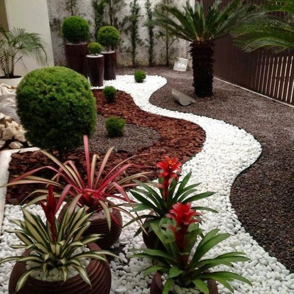 - «Ленивый стиль». Специально для тех, кто не может найти время для ухода за насаждениями, мы придумали вариант «ленивого палисадника». Засыпьте территорию гравием различного цвета. Фантазируйте смелее, не ограничивая себя: гравий засыпается островками, полосками, в хаотичном порядке. Подготовленная поверхность готова для расстановки горшечных растений. Получается очень необычно!