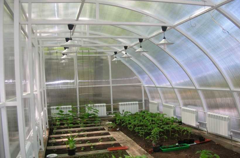 В случае примыкания к дому есть возможность использовать систему отопления коттеджа для нагрева теплицы. Это даст дополнительную экономию средств на устройствах отопления. В качестве покрытия целесообразно использовать рамы с энергосберегающими стеклопакетами или толстым, более 12-16 мм ячеистым поликарбонатом. Стоимость этих материалов довольно высока, но при интенсивной эксплуатации в зимнее время довольно быстро окупиться.