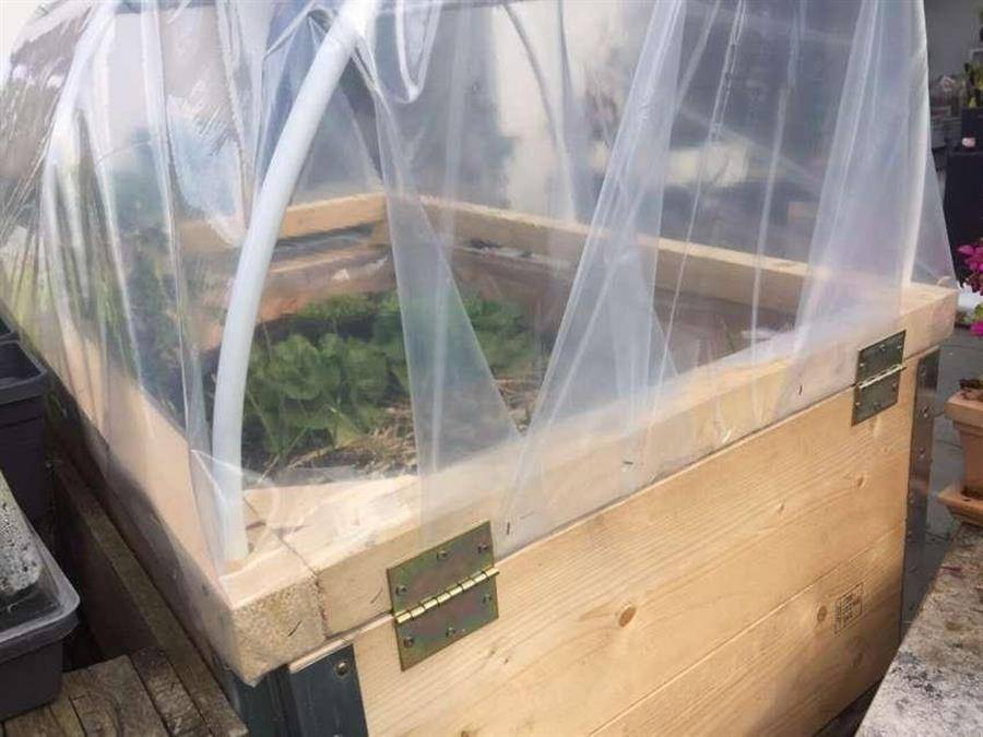 Получившаяся конструкция обтягивается пленкой и на петлях крепится к ящику с рассадой:
