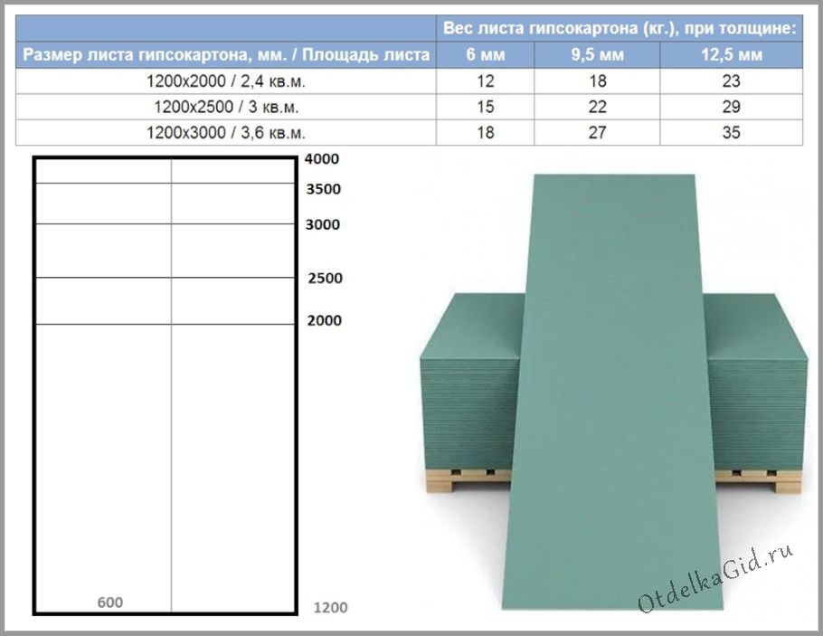 ГКЛ- длинна, ширина, толщина, вес листа гипсокартона стенового, потолочного: