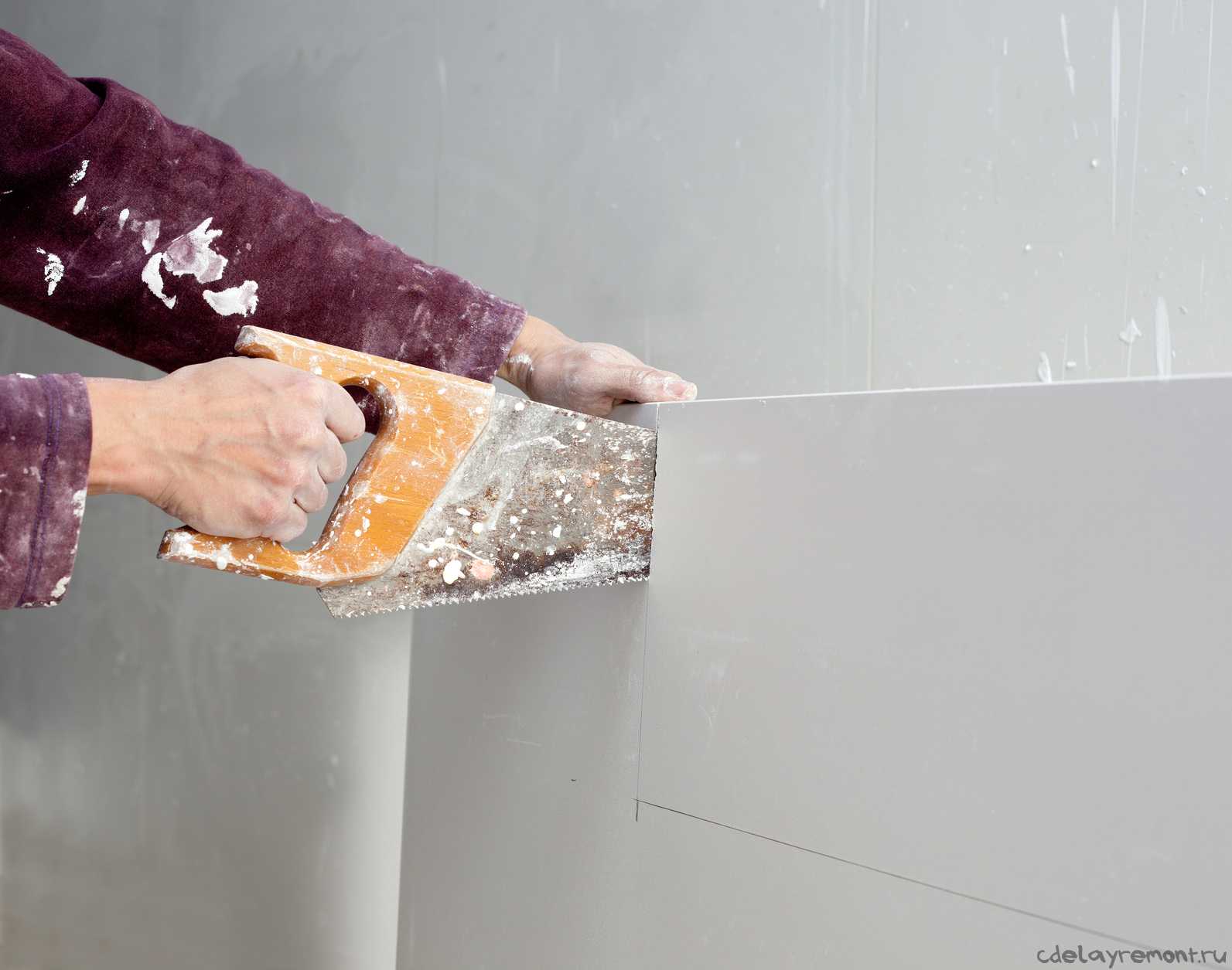 - Допустим, вы решили обустроить раковину в ванной, сделав столешницу из гипсокартона. Чтобы замеры сделать правильно, нужно гипсокартонный лист положить на ровную поверхность, а раковину, повернув дном кверху, разместить на середине листа. Раковину обведите карандашом прямо на листе, какой бы тяжелой она не была. Потом раковину нужно убрать, а электролобзиком вырезать отверстие, намеченное карандашом.