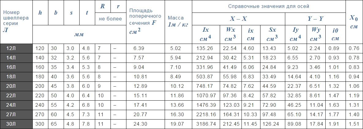 Для определения остальных параметров металлопроката конкретной марки можно воспользоваться специальной таблицей, где указаны ГОСТ швеллера, размеры и другие данные.