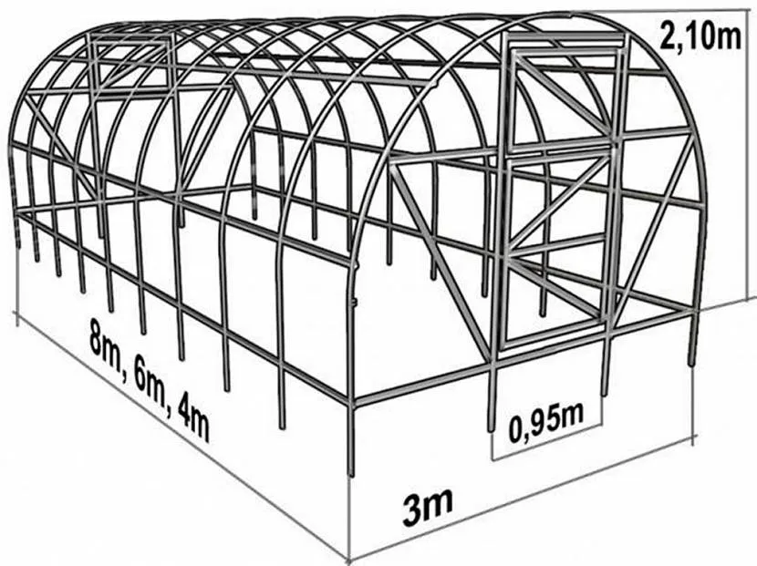 Самая простая конструкция – арочная. Высота парника 2,1 м, ширина 3 м, длина 8 м, дверной проем 0,95 м.