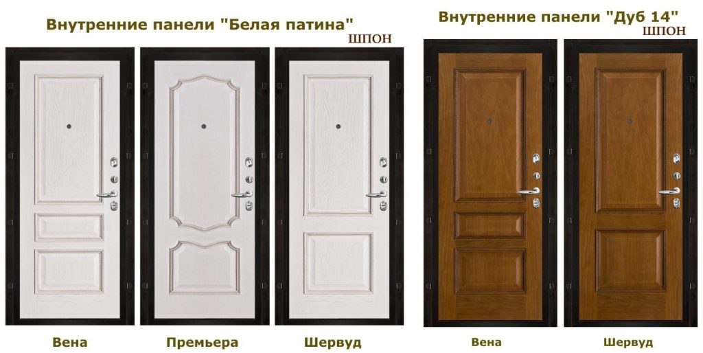 Оригинальный облик входным дверям придает стильная отделка из массива дуба или панелей МДФ с ламинированием. Внешняя часть может комплектоваться стеклопакетом и решеткой, внутренняя – зеркалом.