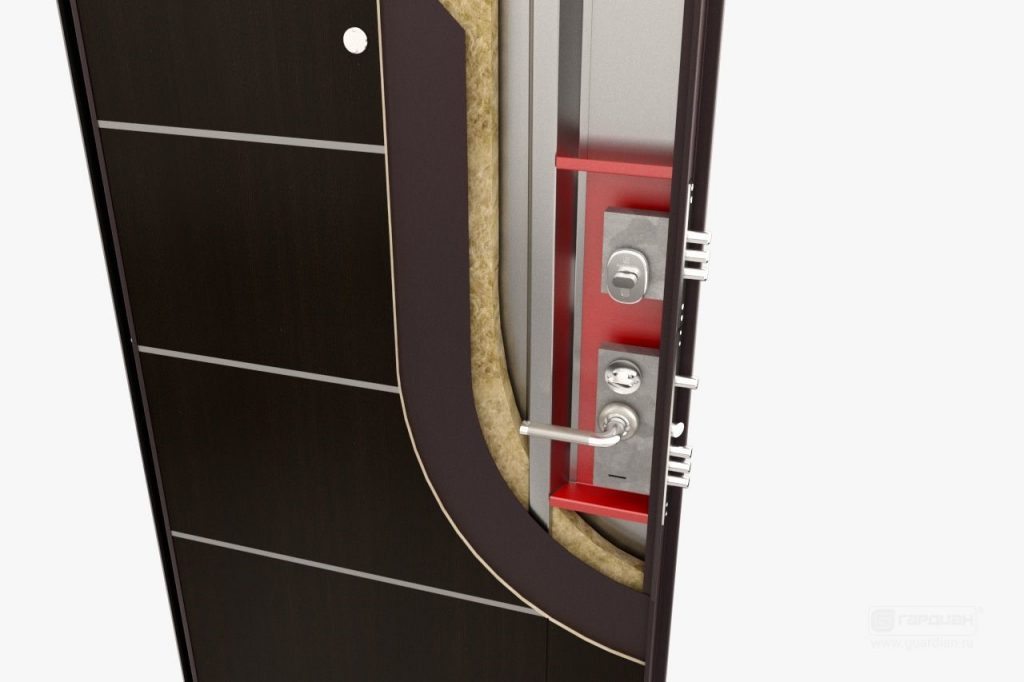 Для надежного запирания используются замки Kale и Moturra. Внутри двери находится минеральная вата. Материал обладает отличными звукоизоляционными свойствами.