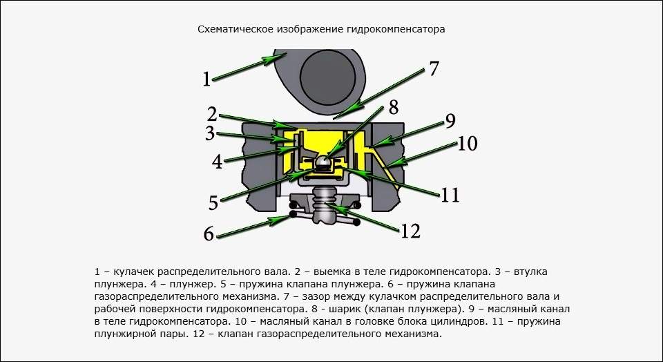 Принцип работы прост. Когда кулачок распредвала поднимается вверх, в накопитель подается масло. Потом кулачок давит на поршень и жидкость позволяет сдержать нажим за счет обратного клапана. Излишки масла уходят из цилиндра и цикл повторяется. Пока все работает как часы, посторонних шумов нет. Но когда появляется неисправность, возникает стук.