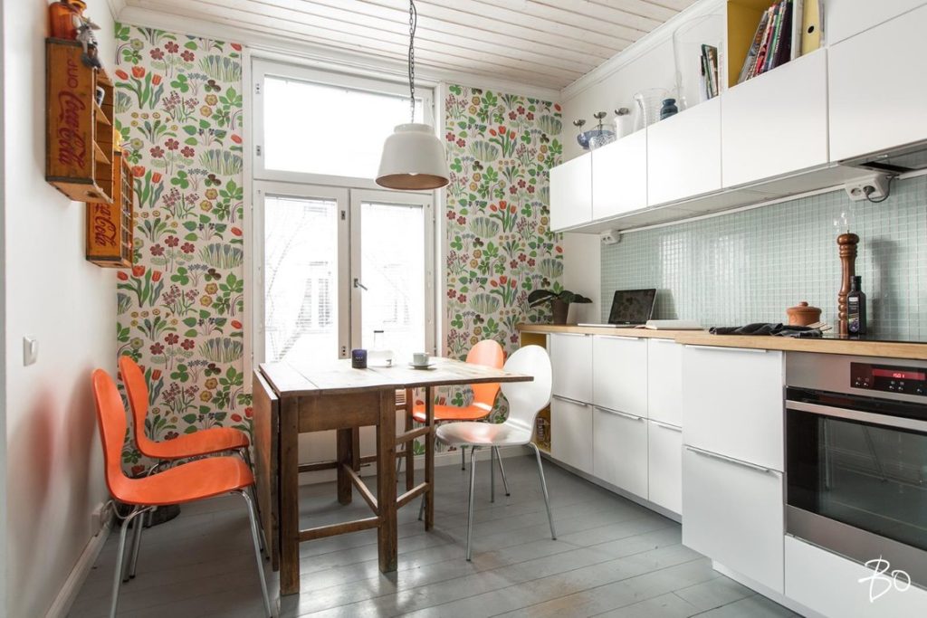 - клеим обои в остальной части кухни;