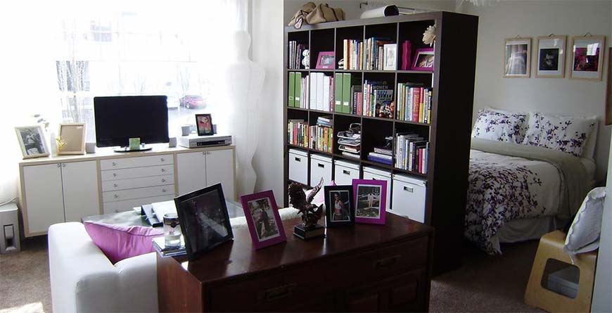 В качестве разделительной перегородки можно поставить небольшой деревянный стеллаж с книгами