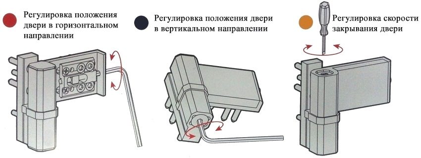 Если пластиковая дверь открывается/закрывается с большим усилием, ее регулируют. Для этого, равномерно вращаются оба регулировочных винта в верхней и нижней петлях, а дверь сдвигается в нужном направлении (в обратную от перекоса сторону).