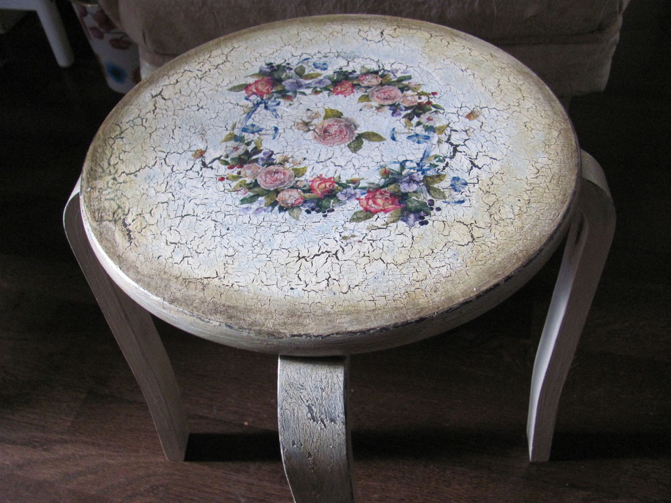 Техника «Декупаж». Для оформления стола в данном стиле используется белый фон, специальный клей, тонкие салфетки с орнаментами и узорами или специальная бумага для декупажа, а также лак, которым покрывается финальный слой. Бумага накладывается на тонкий слой клея и разравнивается, после высыхания необходимо покрыть поверхность лаком.
