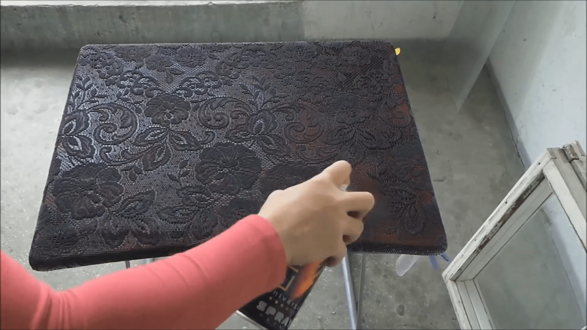 - Прокрасьте тюль. Для этого нужно найти кусок старого тюля. Далее нужно покрасить стол в белый цвет. После высыхания краски нанесите тюль на поверхность мебели таким образом, чтобы расположение рисунка выглядело максимально красиво. Приколите ткань, чтобы она не двигалась во время росписи. Значит нужно взять баллончик и приступить к окрашиванию. Через 15 минут тюль можно снять.