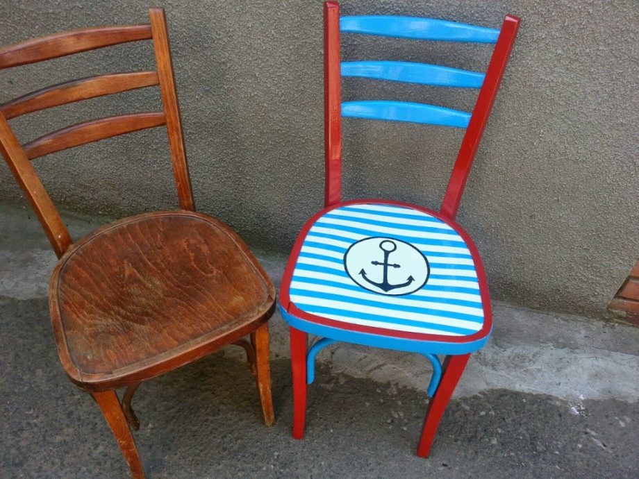 После остается произвести замену изношенных частей и покрыть все лаковым составом или краской. Если стул смог сохранить прочность, достаточно его попросту перекрывать, чтобы делать новый предмет обстановки. Можно окрашивать старые облупившиеся детские стулья в яркий цвет и расписывать простым узором, чем ребенок будет крайне рад.
