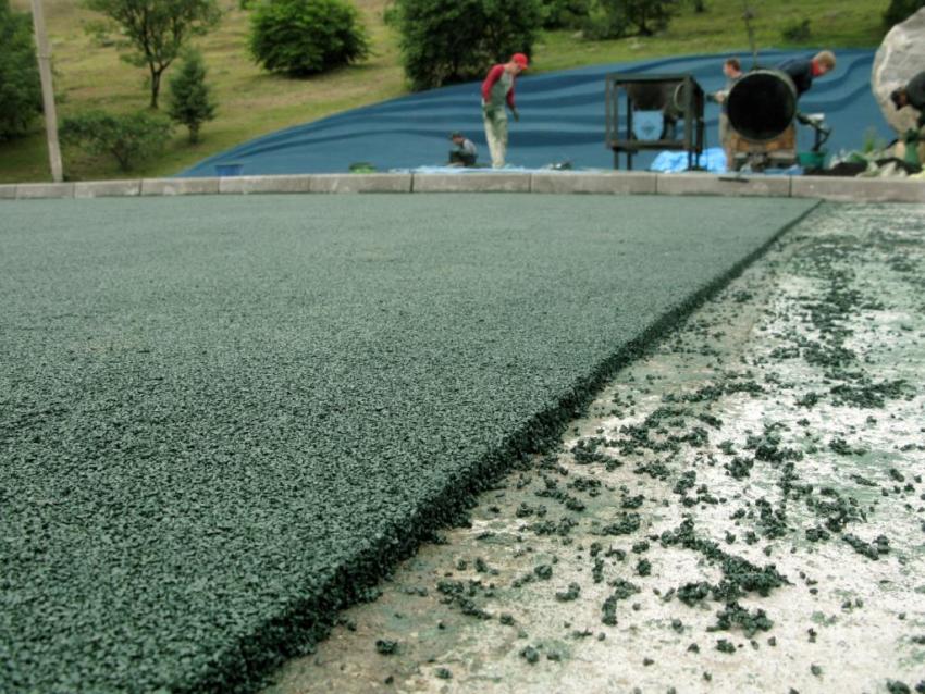 Никаких особых секретов укладки нет. Если вы когда-нибудь работали с бетоном, то это что-то очень похожее. Укладывать можно на утрамбованный мелкий гравий, песок, отсыпку. Отлично подходит бетон и асфальт в любом состоянии. Что хорошо, что их даже не надо выравнивать. Вообще, большое количество неровностей увеличивает расход крошки, а это затратно по деньгам. Поэтому многие предпочитают предварительно залатать предполагаемое место нанесения.