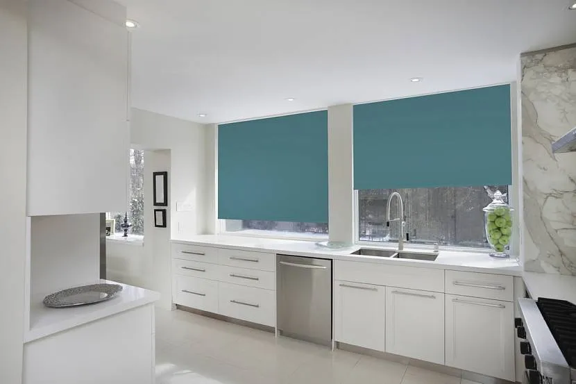 Бирюзовая рулонная штора станет контрастным акцентом на белоснежной кухнеИсточник rolgroup.com.ua