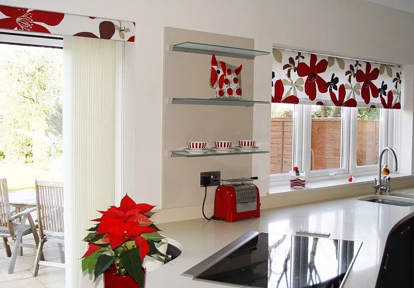 Красные цветы на рулонных шторах красиво смотрятся на белоснежной кухнеИсточник design-homes.ru