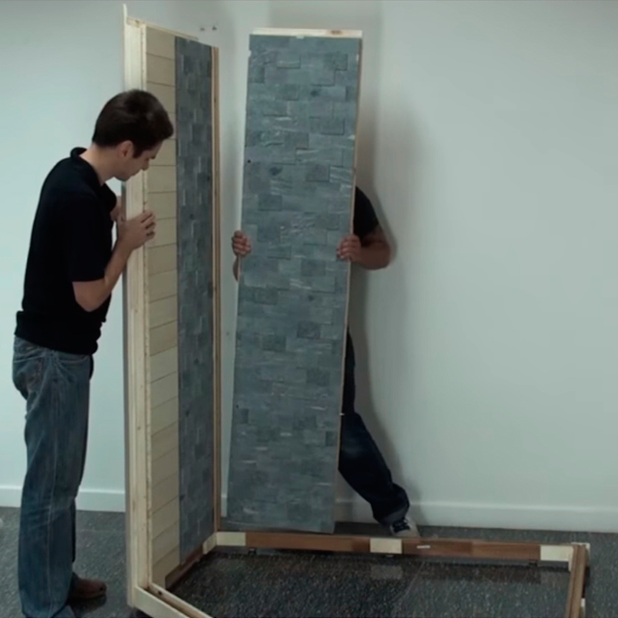 При устройстве парилки каркас крепится через специальные отверстия по линиям. Шаг сверления составляет 60 см, отверстия следует закрыть деревянными пробками и капроновыми дюбелями. На следующем этапе нужно подготовить щит, который хорошо шлифуется наждачкой и укладывается на три стороны каркаса. Между щитами прокладывается резина, крепление осуществляется мебельными уголками, которые потом прикрываются плинтусом.
