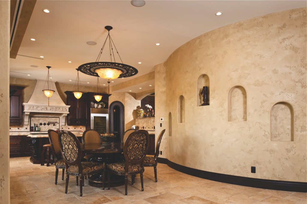 Логичным дополнением такая отделка станет и для столовой, оформленной в пышном ампире, барокко или рококо. Также она будет хороша в менее торжественных арт-деко или провансе, при условии грамотного подбора цветов.