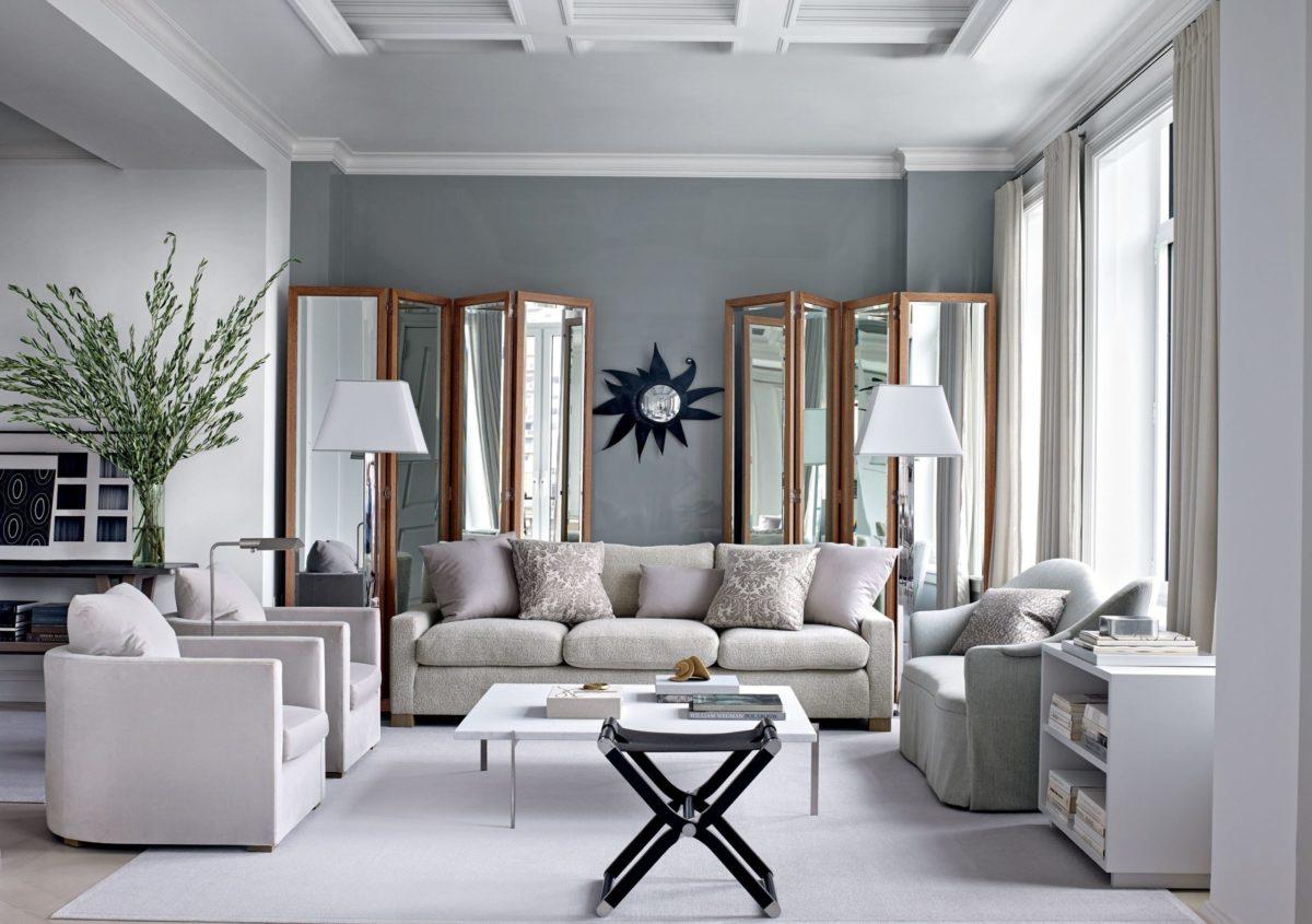 Мебель можно выбрать нейтральных цветов или под цвет стен и потолка гостиной. В серо-голубой гостиной красиво смотрится натуральное дерево. Аксессуары, мебель, отделку выбирают из материалов с разной фактурой, например, ворсистые ковры, дерево, стекло, бронзу.