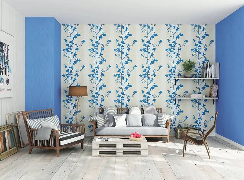 Серые с голубым обои для гостиной рекомендуется выбрать с растительным, классическим или геометрическим орнаментом.