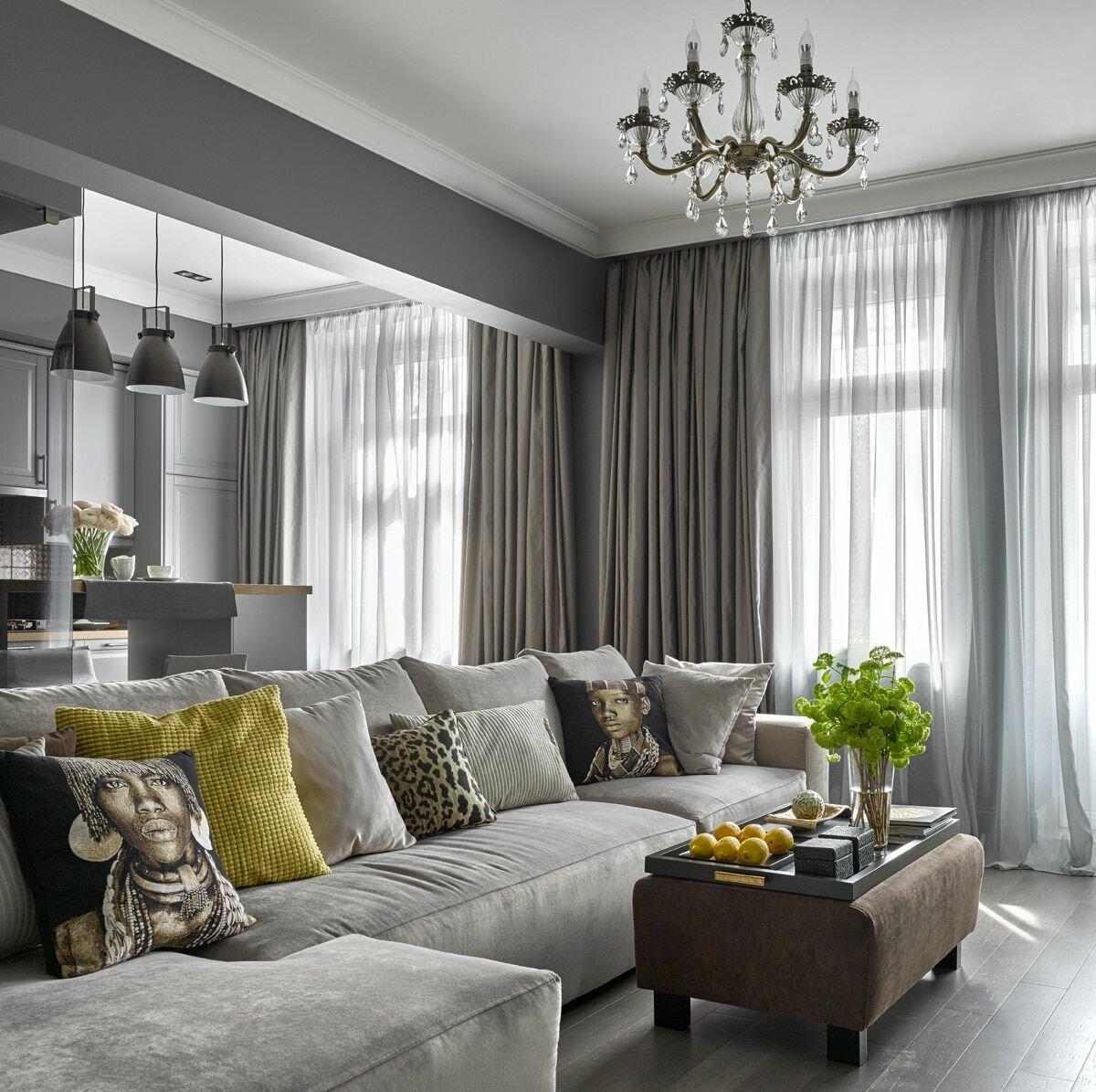 Если гостиная достаточно просторная, для неё подойдёт как монохромное серое оформление, так и сочетание нескольких оттенков разной светлоты. Зонирование в кухне-гостиной с серыми стенами может выполняться как раз за счёт окрашивания стен в двух близких оттенках одного цвета.