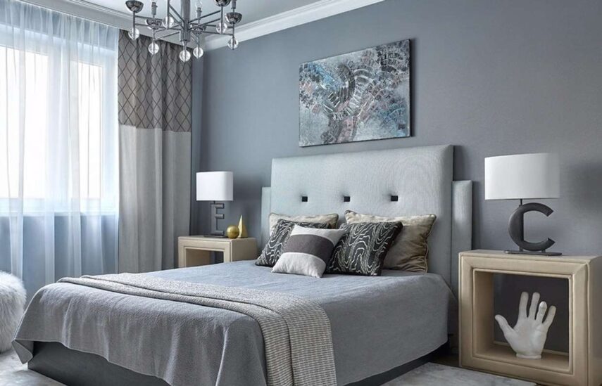 Для спальни следует выбрать светло-серые стены, которые позволят успокоиться перед сном и станут отличной базой для оформления пространства в выбранном стиле.