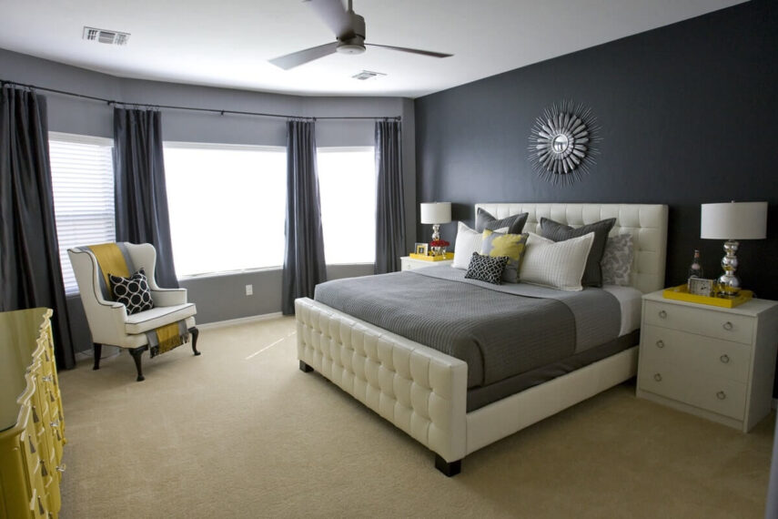Великолепное сочетание — желтый и серый. Но желтый слишком яркий, поэтому использовать его можно лишь в качестве акцента. Это цветовое сочетание отлично смотрится в гостиной и спальне.