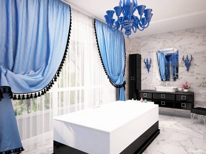 - Фактуру занавески. На плотном полотне, цвет будет смотреться более насыщенным. Синие бархатные портьеры сделают атмосферу тяжелой. Если их нужно облегчить, используют кисти, бахрому, ламбрекены, подхваты белого или серебристого тонов.