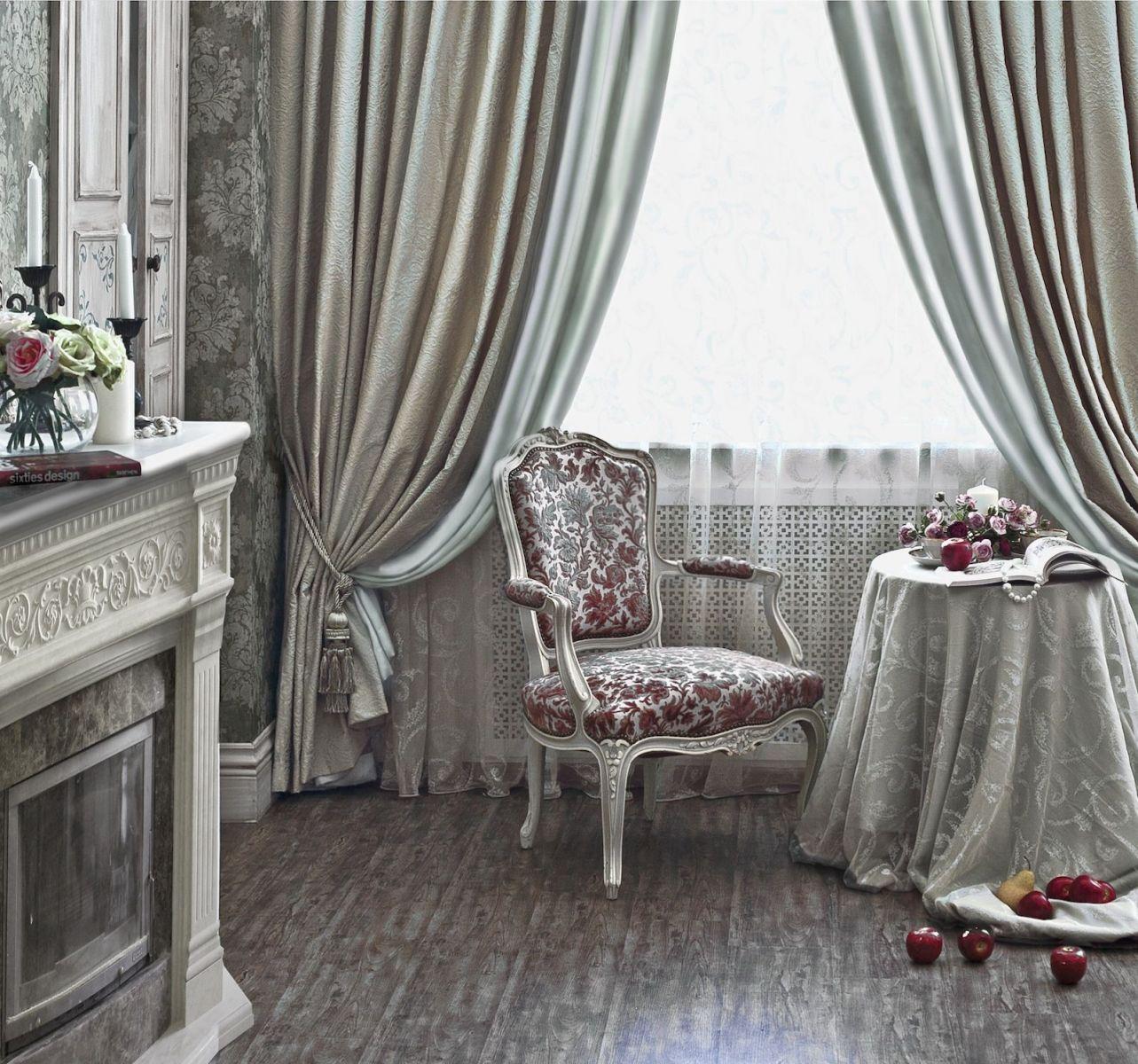 Для строгой классики подойдут пепельные, жемчужные, перламутровые портьеры, однотонные или с серебристым орнаментом. Они придадут помещению торжественность, особенно если шторы изготовлены из тяжелых тканей: бархата, велюра, атласа, парчи. Оформление окна ламбрекеном или подвязками привнесет в интерьер ноту роскоши и богатства.