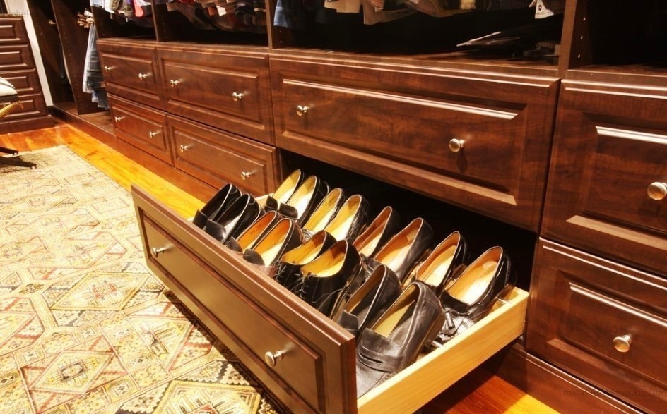 Ящики также можно использовать для хранения обуви. Хотя эти стеллажи занимают больше места, чем полки, они хорошо скрывают обувь от пыли и посторонних глаз. В глубоких шкафах используются выдвижные полки, позволяющие быстро найти нужную пару.