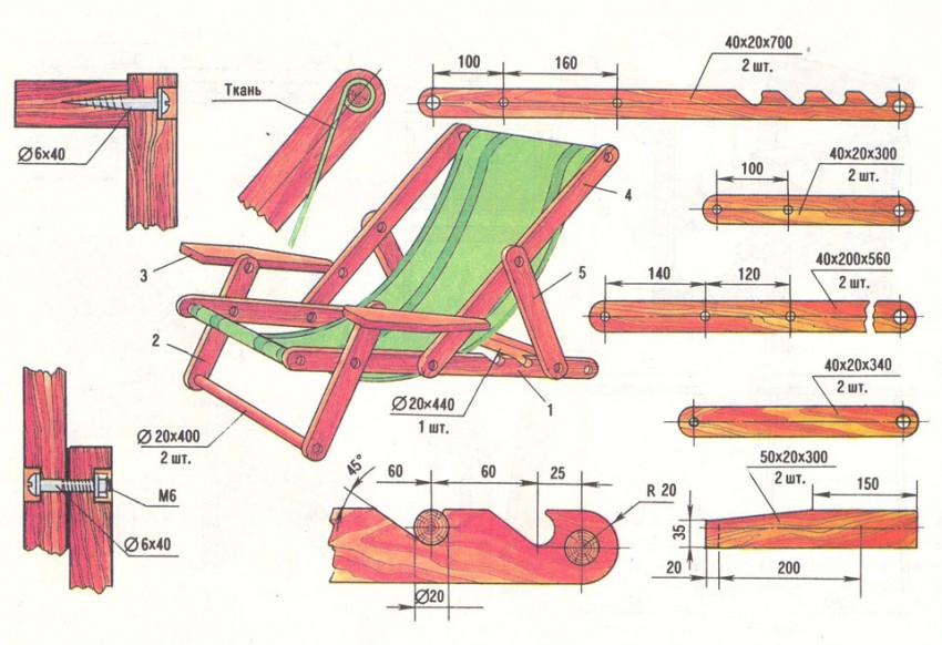 Рейки лучше делать из пород с твердой древесиной, к числу которых относятся береза, бук или дуб. Для изготовления шезлонга лучше использовать ткани, которые отличаются повышенной прочностью и устойчивостью к стиранию. Например: парусина, брезент, джинс, матрасный тик, камуфляжка.