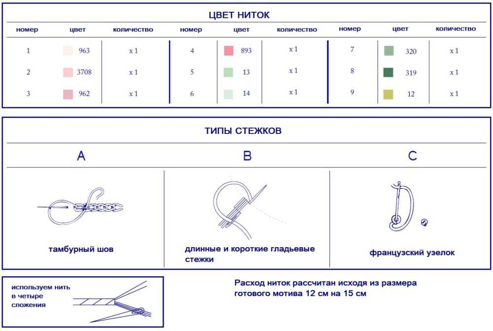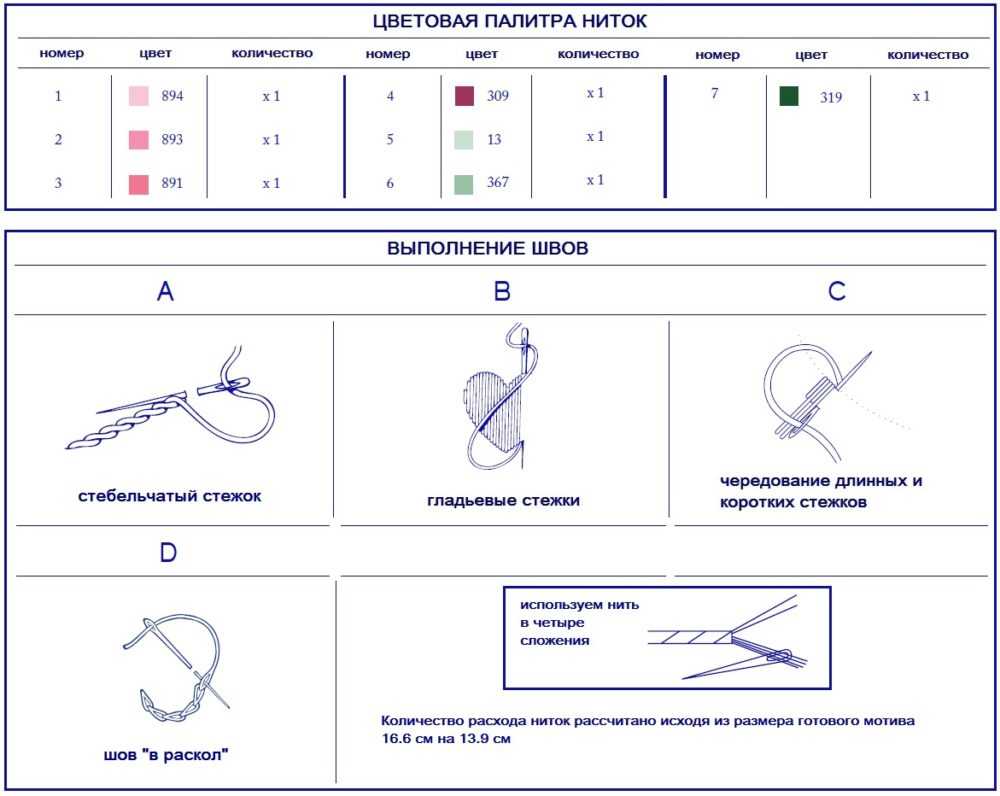 Работа не займет много времени, так как количество используемых швов тут минимально: стебельчатый стежок и гладь.