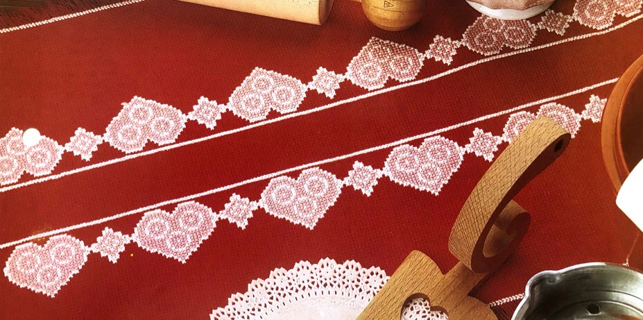 Определите центр полотна «Аида» и отметьте горизонтальным и вертикальным наметочными стежками. Следуя схеме, вышивайте крестом хлопчатобумажными нитками Перле сначала две центральные полосы, затем сердечки и ромбы, начиная с центрального сердечка каждого ряда.