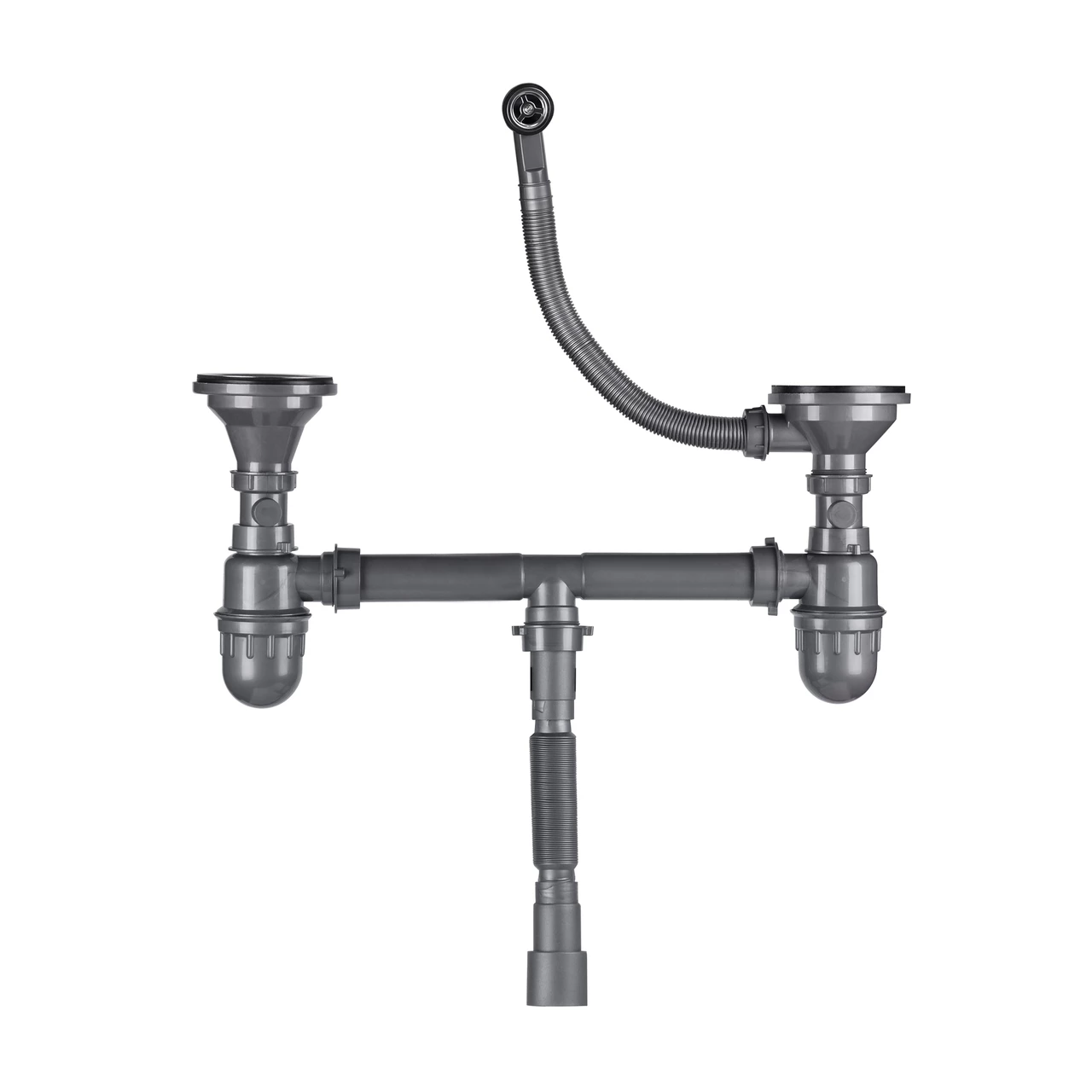 Если не подходит одинарный сифон, подбираем двойной. Он может иметь один или два уровня. Колба (или изгиб, в конструкции трубного типа), в которой отстаивается вода, будет либо по центру между раковинами (мойками), либо смещена в сторону.