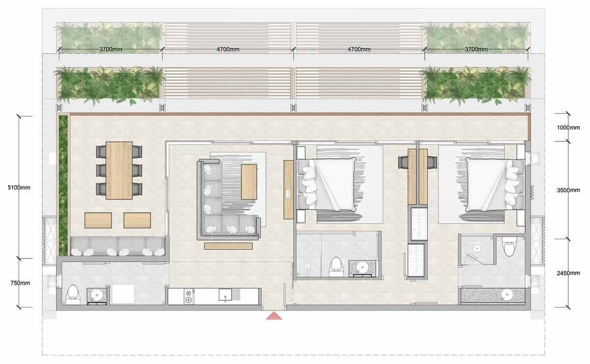 Эта практичная планировка трехкомнатной квартиры площадью 110 квадратных метров имеет две спальни, в каждой из которых есть ванная комната и гардеробная. Кухня не имеет окна, но спроектирована в американском стиле – с островом и столовой на четыре персоны. В гостиной двери на балкон решены в формате дверей-слайдеров со стеклами от пола до потолка.