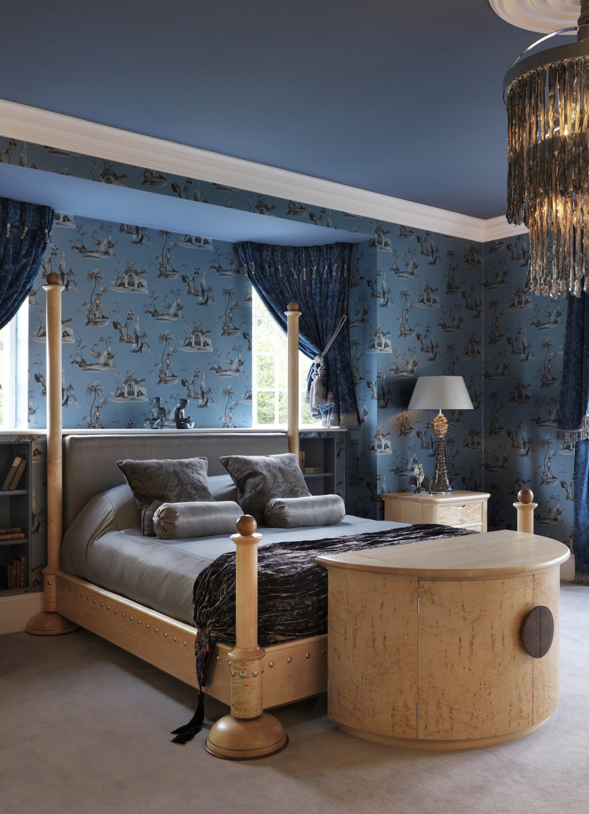 Синие обои в интерьере спальни могут быть основным акцентом, а также нейтральным элементом.