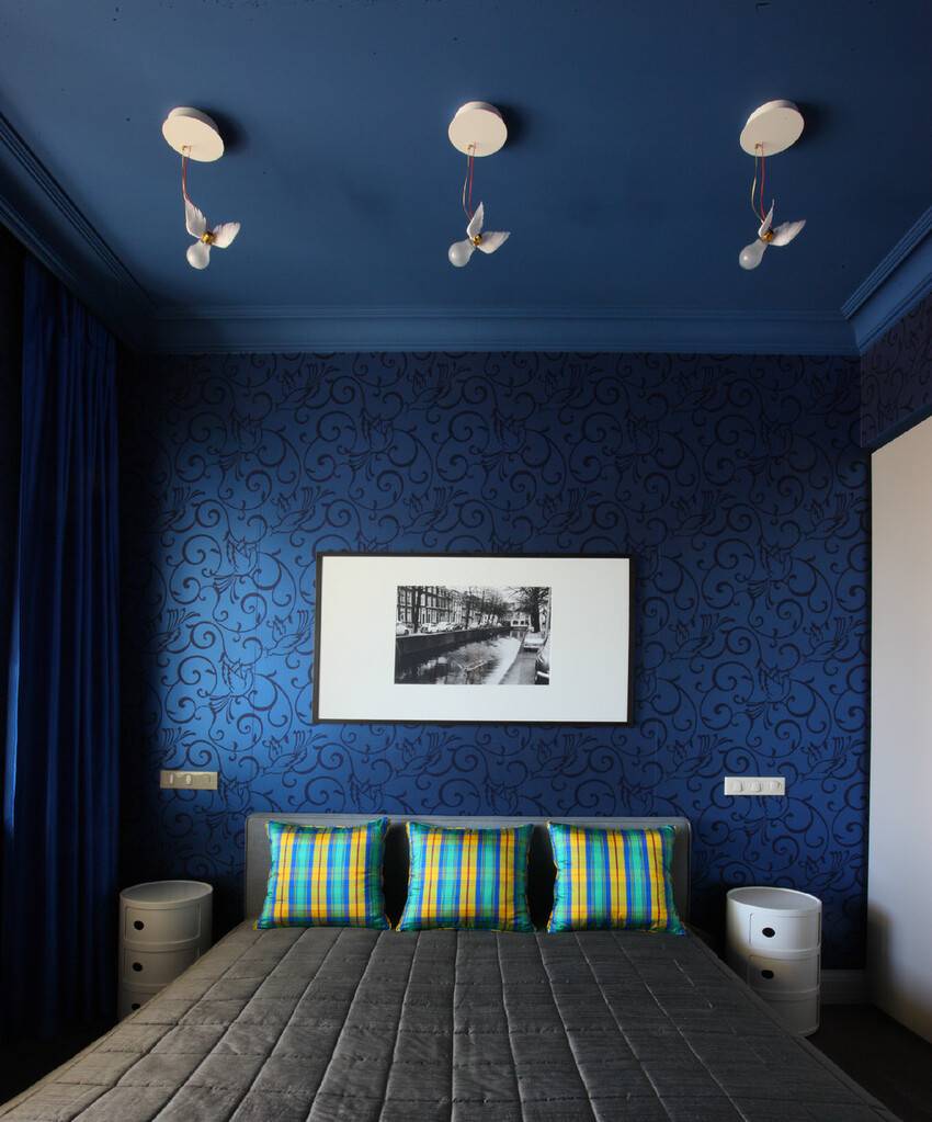 Синий цвет на полу и потолке гарантированно делает комнату яркой и самобытной. Он может объединять стены и потолок или оттенять верх спальни. Особенно эффектно смотрится помещение неправильной формы, выкрашенное лишь частично: например, мансарда с покатой крышей.