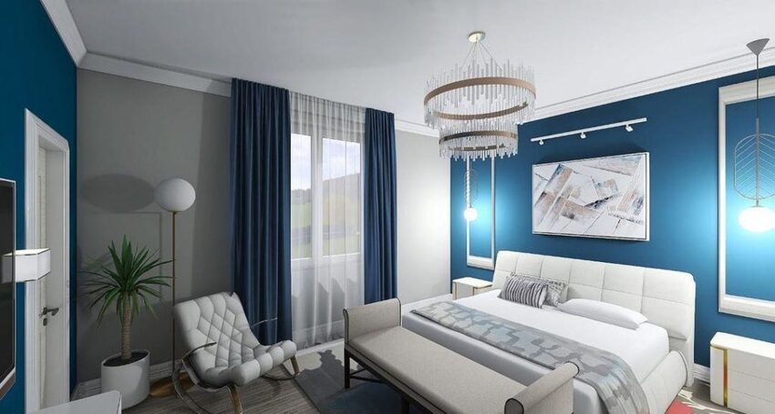 Правильное освещение и декор синей спальни