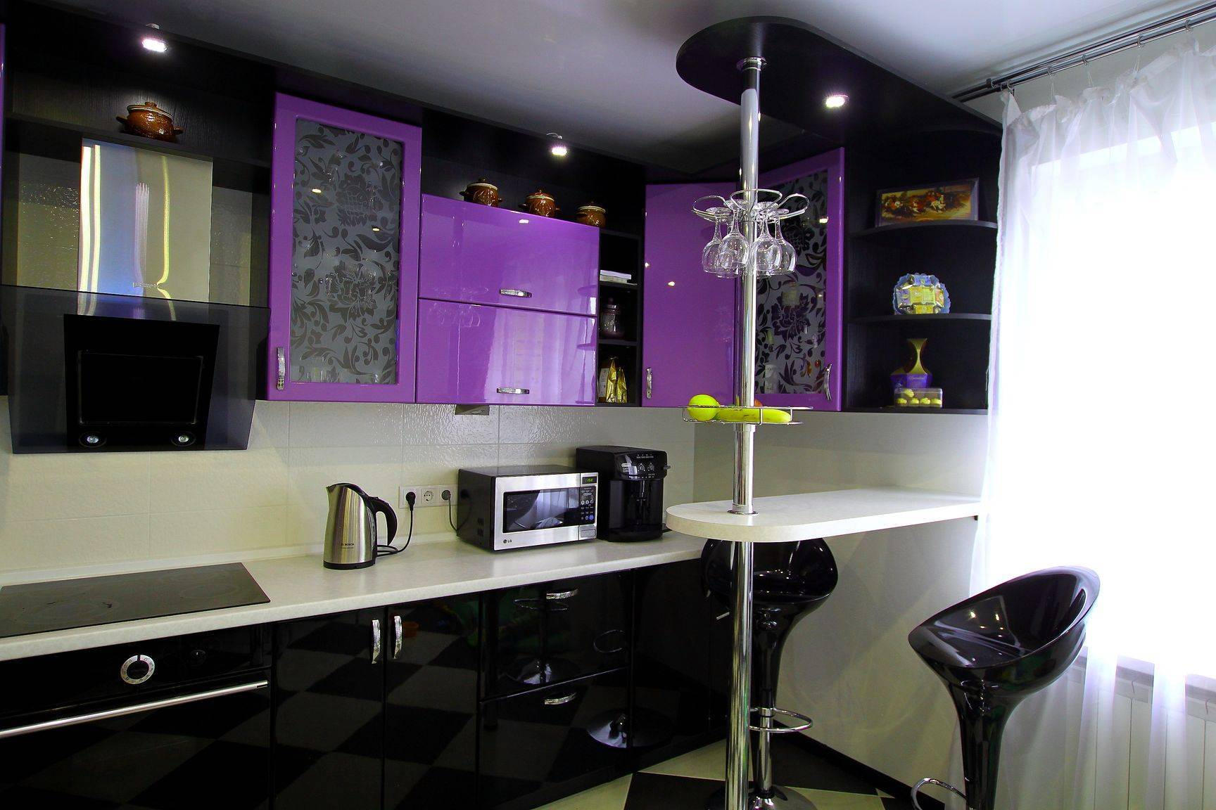 Тогда кухонный гарнитур, стены и потолок могут быть любого цвета. А дополняться они будут интересными фиолетовыми деталями. Это могут быть стулья, диван на кухне. Если яркий предмет достаточно крупный по размеру, стоит ограничиться только им и не добавлять дополнительные фиолетовые аксессуары.