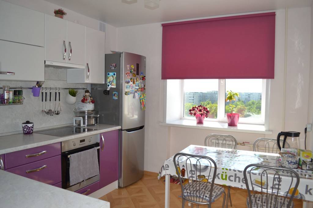 Если помещение маленькое, целесообразно применять кухонные шторы сиреневого цвета длиной до середины окна: они пропускают много света, не утяжеляя обстановку. На кухне в стиле хай-тек уместны ровные сиреневые шторы из натуральной однотонной ткани.