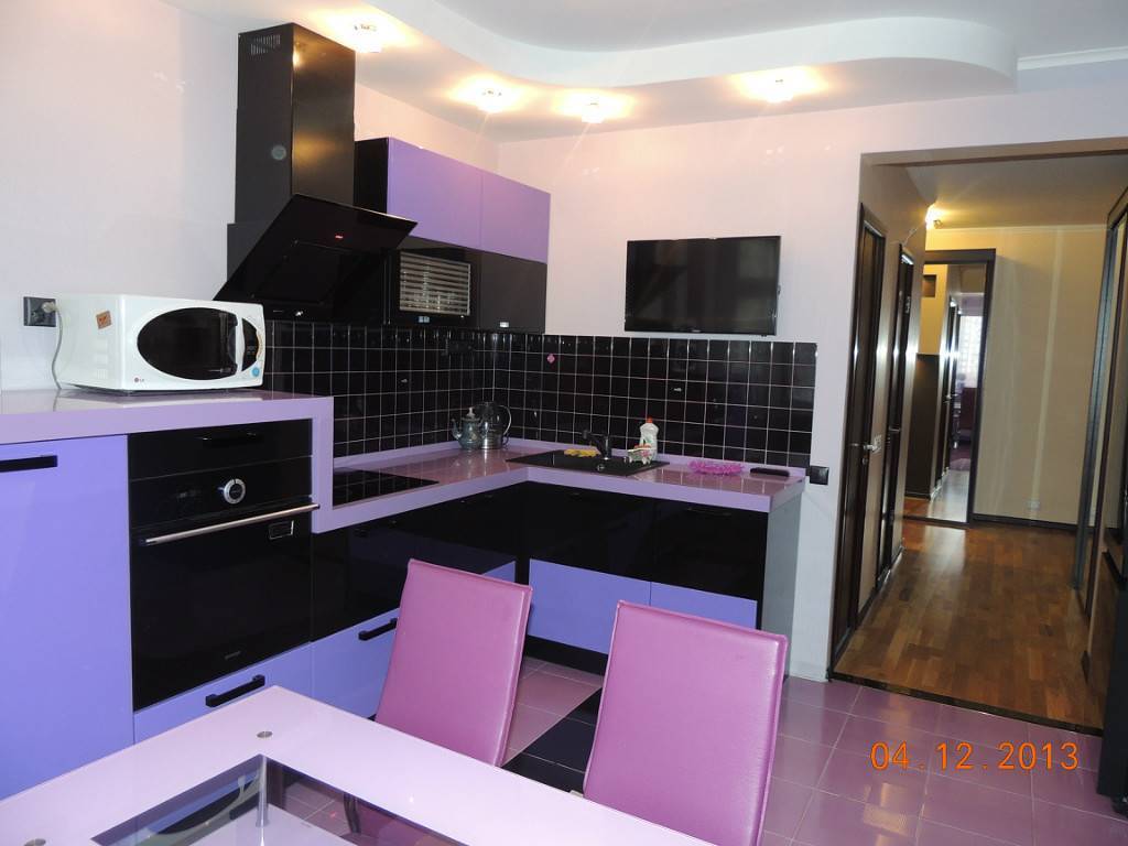 Фиолетовый цвет гармонично объединит гостиную и кухню. Например, на кухне фиолетовый гарнитур и песочные стены, в зоне гостиной фиолетовые обои и песочная мебель.