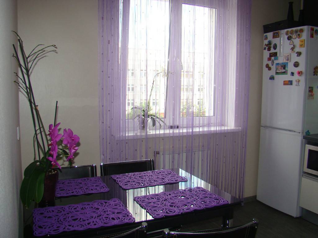 В кухне, выполненной в современном, минималистическом или этническом стиле, отлично смотрится кисея любого из фиолетовых оттенков