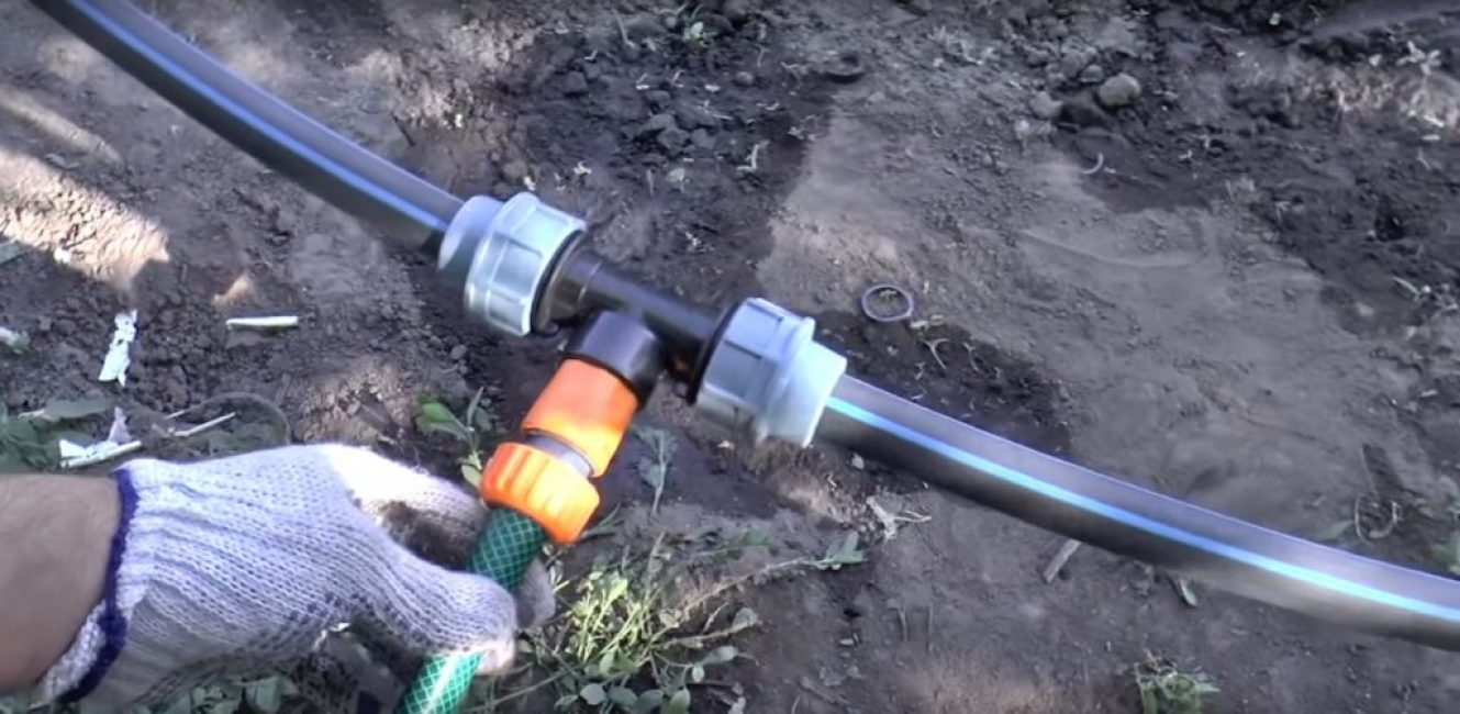 Затем подсоединяется гибкий шланг. Она отводит воду от места установки катушки к «главной» трубе, которая распределяет воду по капельным лентам. Для прокладки «линий» подходят изделия из ПВХ или ПНД.