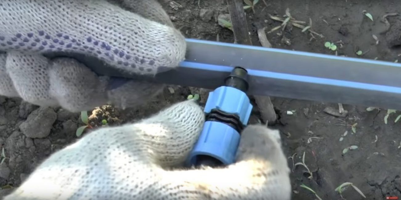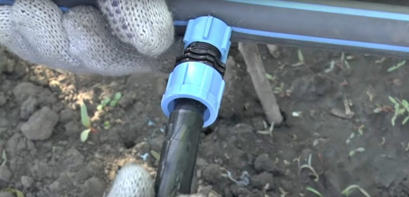 Наденьте гибкий шланг на пластик и закрепите его, повернув пластиковую гайку в обратную сторону. Затем полосы натягиваются по всей ширине грядки.