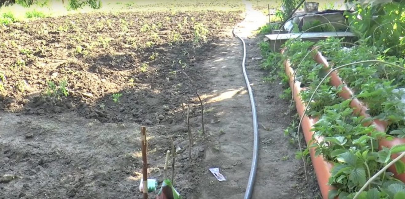 К форсункам прикреплены капельные ленты. Их длина должна соответствовать ширине грядки, чтобы вода поступала ко всем растениям.