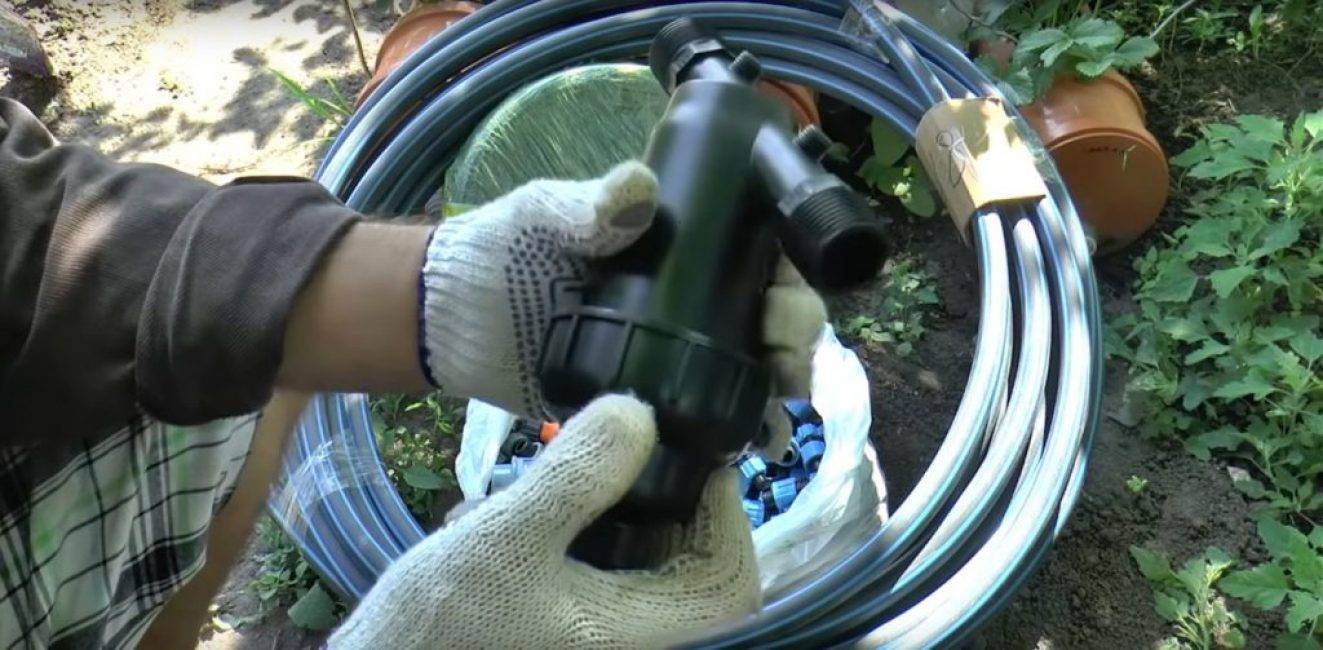 Далее устанавливается специальный фильтр. Это необходимо для предотвращения попадания в воду грязи и частиц, которые могут забить отверстия в капельном шланге и тем самым ухудшить работу системы.