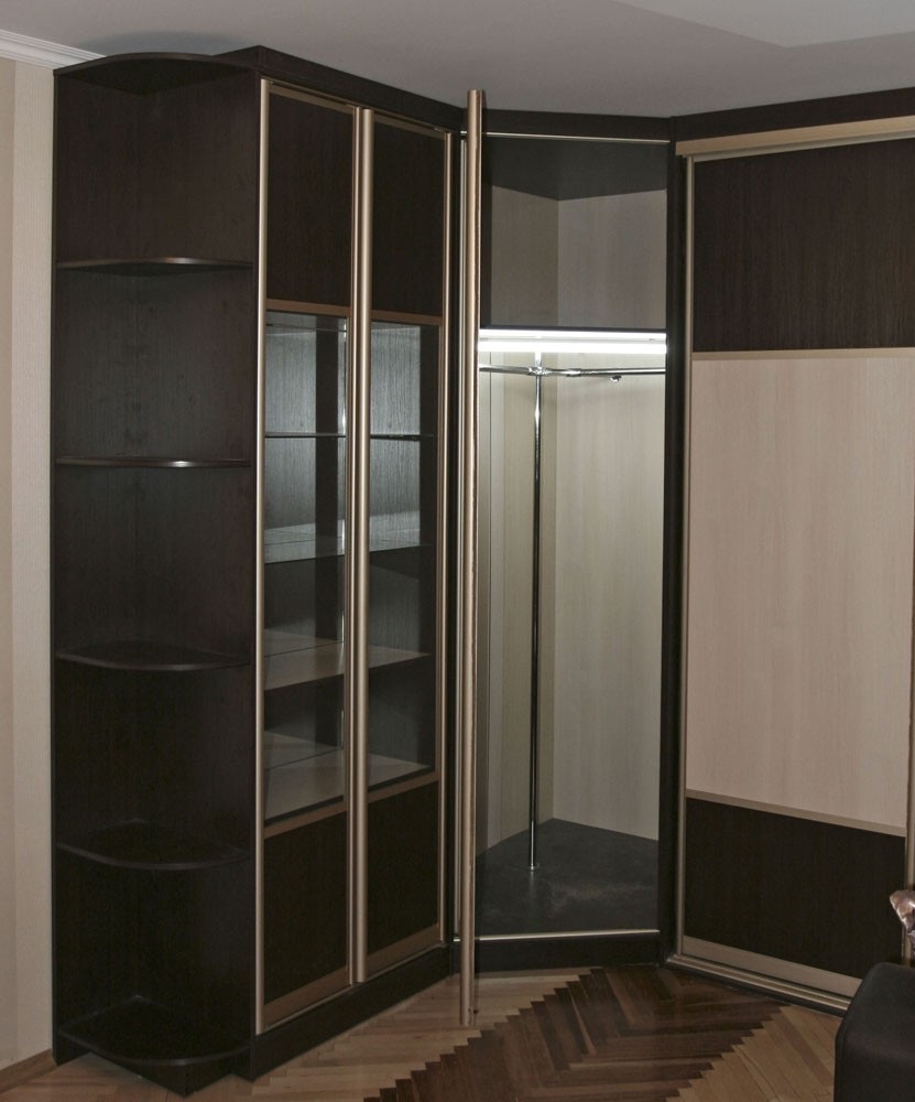 При наличии свободного угла, стоит присмотреться к угловым или радиусным моделям. Отличаются такие шкафы своей вместительностью. Но такой вариант не подходят новичкам в столярном деле, так как их изготовление требует особых навыков.