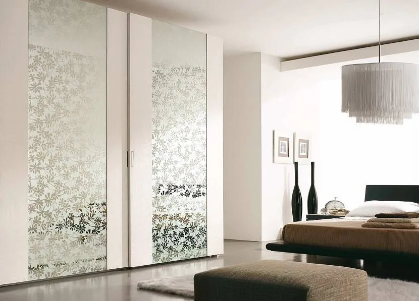 Это способ декора зеркальных и стеклянных поверхностей матовым рисунком. Шкаф-купе в спальне с фасадом, украшенным по этой методике, станет колоритным элементом и сделает комнату нарядной и свежей. Рисунок наносится по стандартным или лично разработанным трафаретам, так что при желании можете попробовать воплотить свои фантазии в реальность.