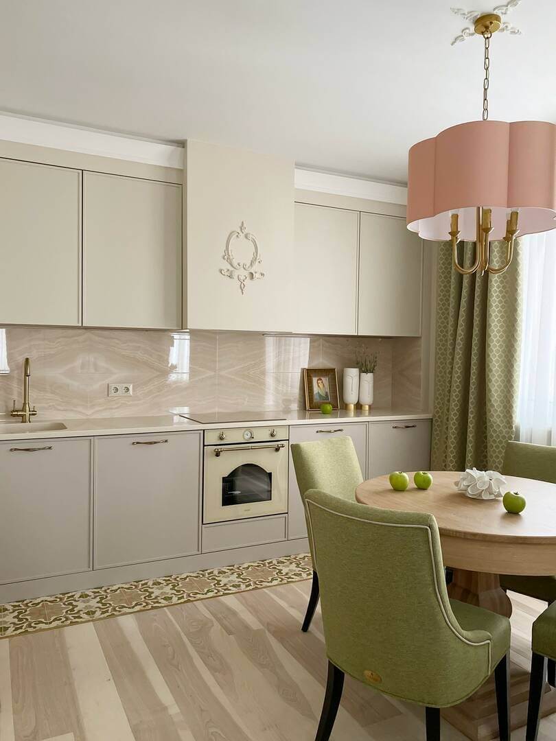 Довольно часто можно встретить в одной кухне два разных решения: нижние шкафчики с классическими ручками, верхние — без ручек. Фасады могут быть выполнены в едином цвете или нескольких близких оттенках, как здесь. Проект квартиры «Почему-то фламинго», дизайнер Татьяна Крыгина