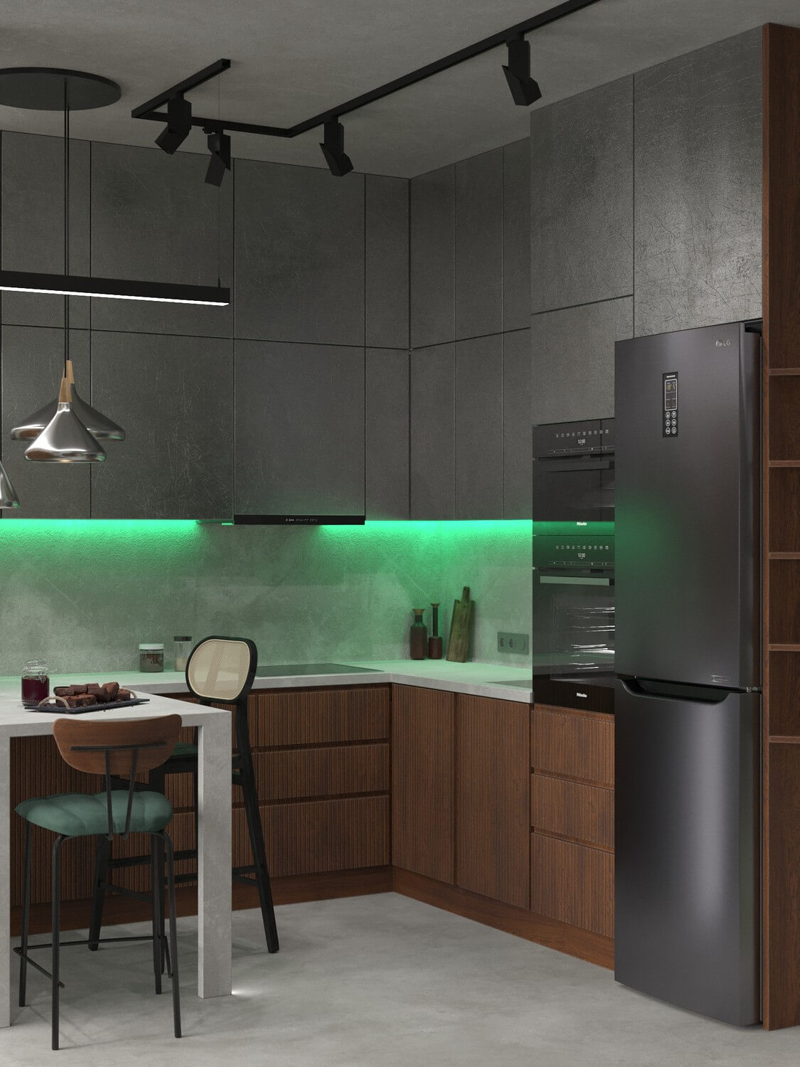 Современные дизайнеры часто выбирают для кухонь тёмные оттенки. Коричневый, серый, чёрный и их сочетания бывают очень выразительными. Точечная подсветка рабочей зоны тоже может вносить разнообразие в дизайн — ведь можно использовать не только классический белый или жёлтый свет. Проект квартиры «Самурай», дизайн — бюро Алёны Горской