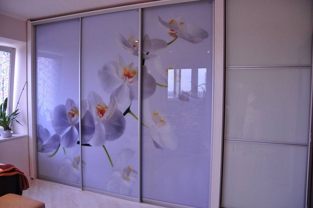 Фотопечать – рисунок любой сложности. Купейная дверь представляет собой стекло с наклеенной на внутреннюю сторону пленкой с узором. Благодаря современным технологиям принт не выгорает, даже если постоянно подвергается воздействию ультрафиолета. Фасады с фотопечатью выглядят свежо и оригинально.